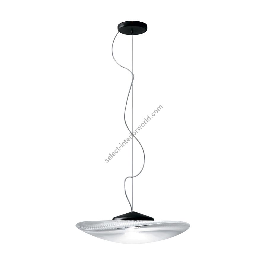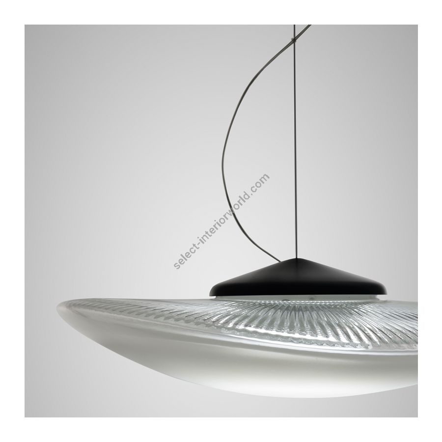 Pendant lamp with transparent blown glass diffuser, striped on the top part and sandblasted at the bottom. Black painted metal structure.