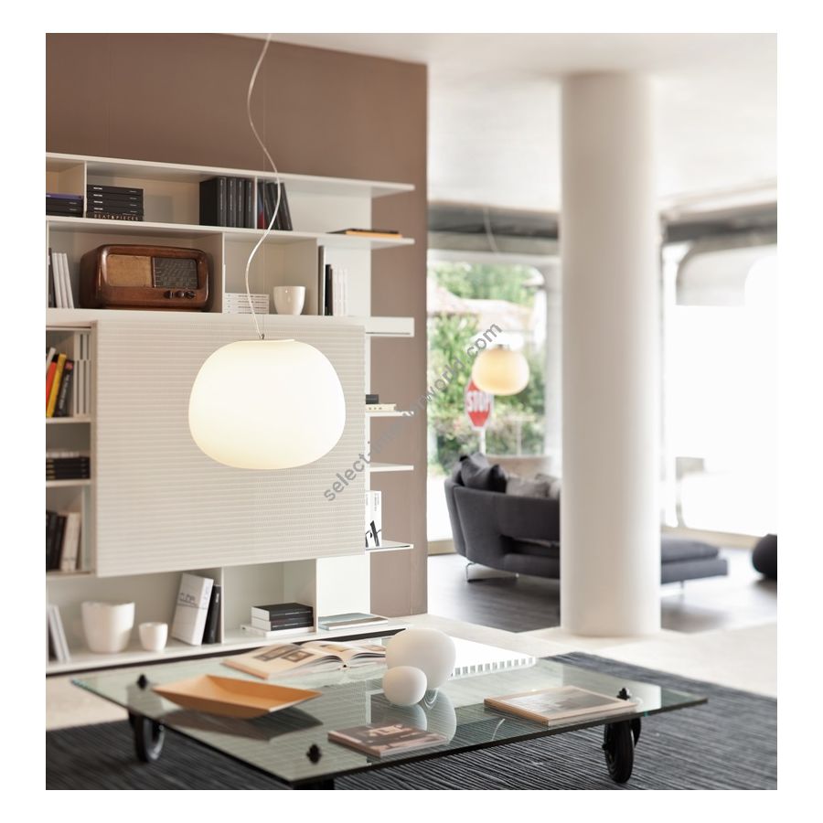 The collection is made up of hanging, table, floor, wall and ceiling lamps in many different shapes and sizes, for indoor use. In addition, the Mycena series makes it possible to create layouts with different glass panels using the special accessory, while the Mochi series also has a range of “falling” hanging lamps. All the diffusers are in white satin-finish blown glass, while the load-bearing structures are in white painted metal or polyester, reinforced with glass fibre. The lamp runs on mains power and is suitable for use with halogen, fluorescent and LED bulbs.