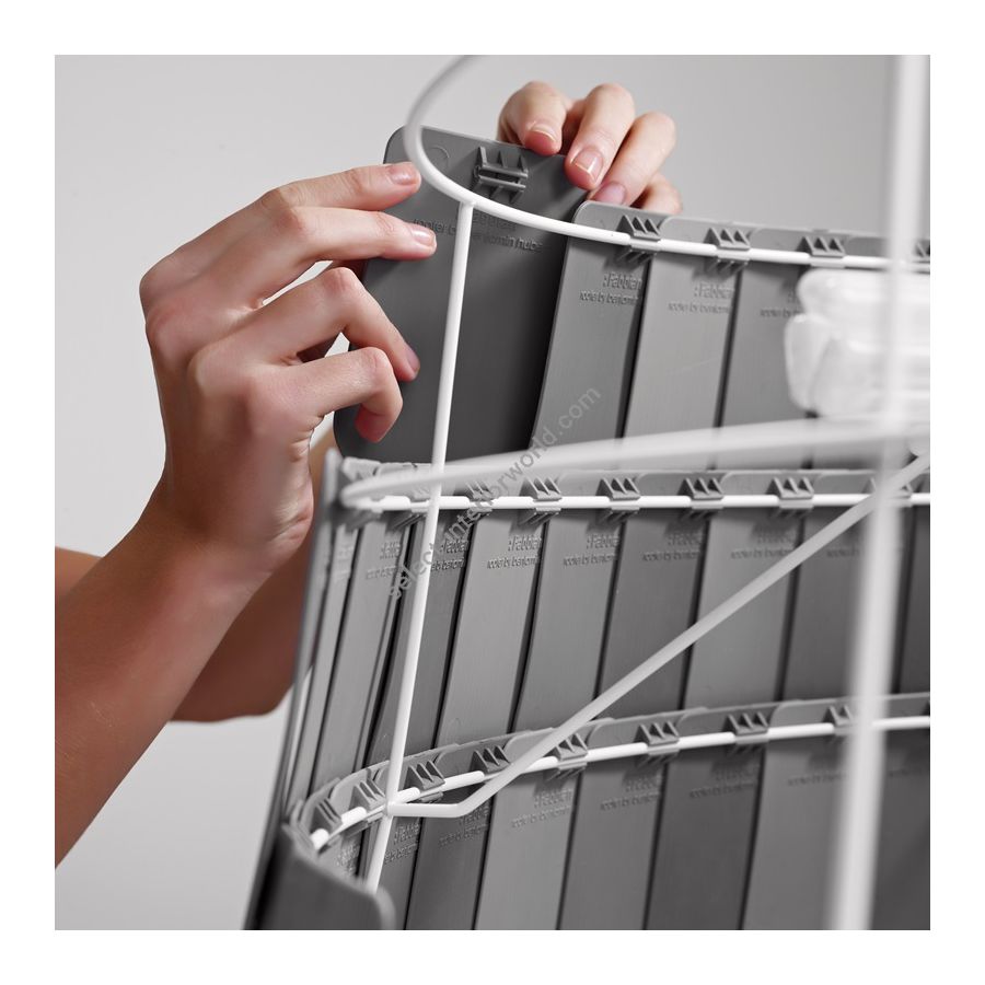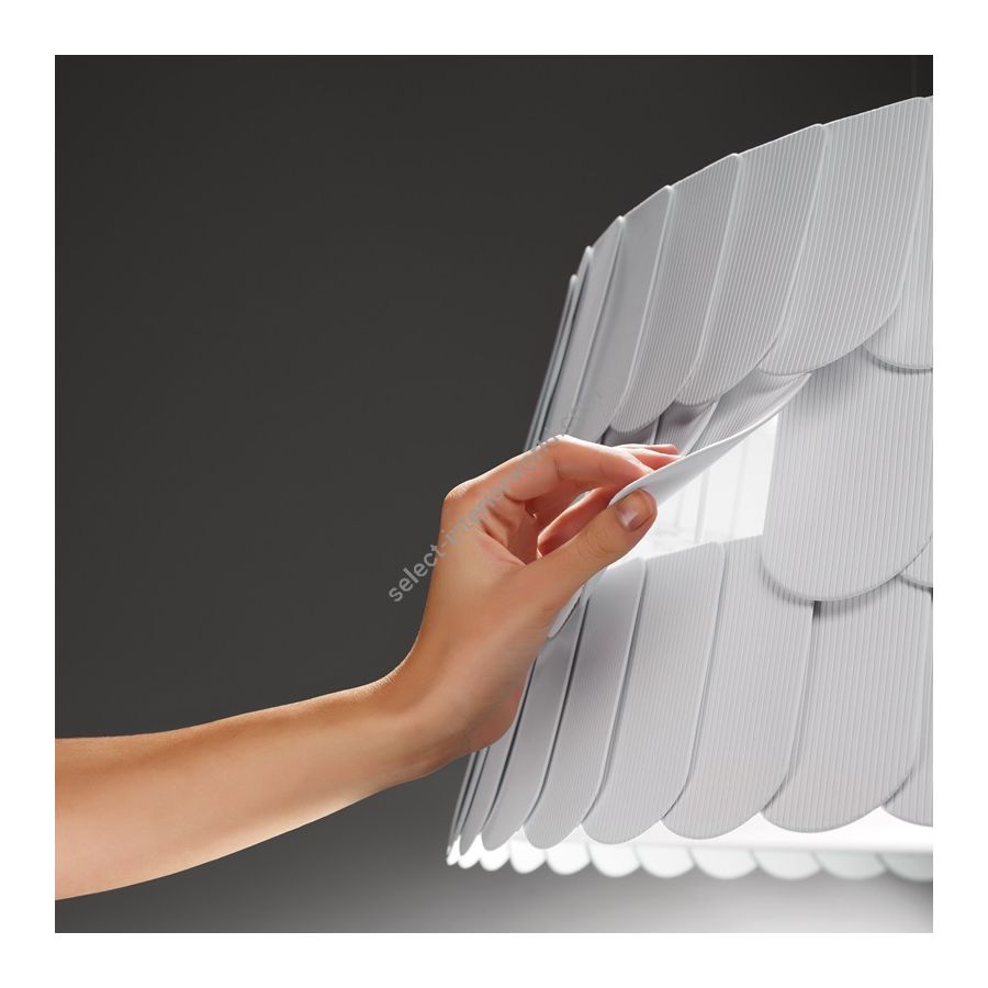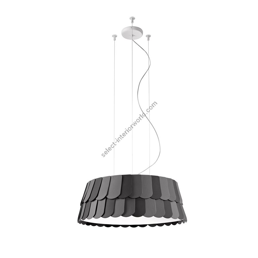 The collection is made up of hanging lamps for indoor use, in five different shapes, and can also be fitted directly to the ceiling rose by simply shortening the cables. The frame is covered in scales made of a semi-rigid rubbery material, in four different colours (white, grey, brown and green), while the round diffuser is in white fabric. The lamp runs on mains power and is suitable for use with halogen and fluorescent bulbs.