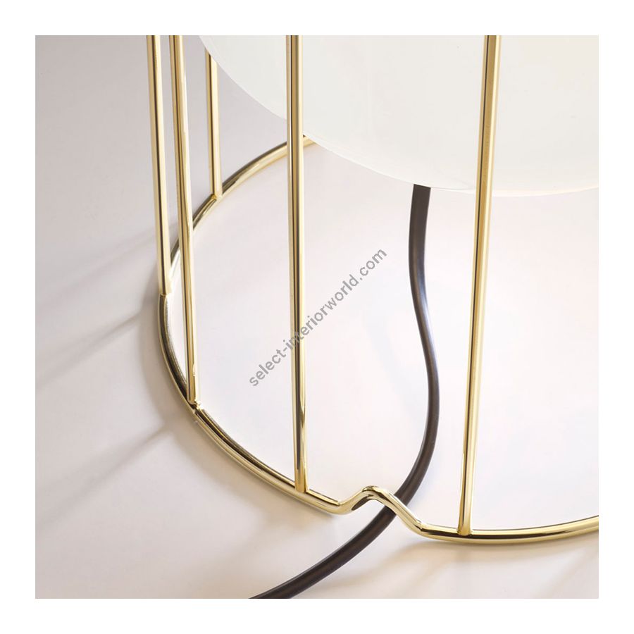 The Aérostat collection is composed of indoors hanging, table and floor lamps. Hanging and table lamps are available in two diffuser sizes with a metal cage acting as support, while the floor lamp is available in one size only. All diffusers are in shiny white blown glass whereas the metal cages are in brass, black chrome and copper finish, all shiny. Electrification on main voltage for LED bulbs.