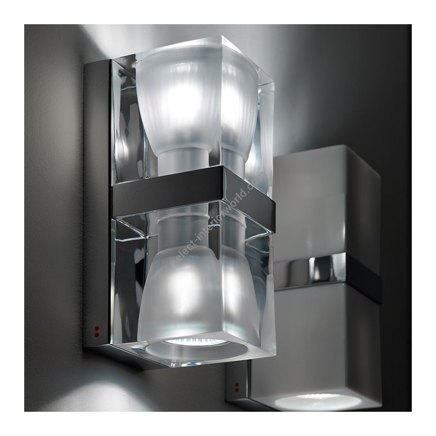 The Cubetto wall lamp with double light source is available in transparent crystal, or white and black galss. The wall lamp is suitable for halogen or led bulbs and it creates stunning light effects on the wall. It is perfect for the lighting of the bathroom, the corridor or the bedroom both in a hotel or in a private home.