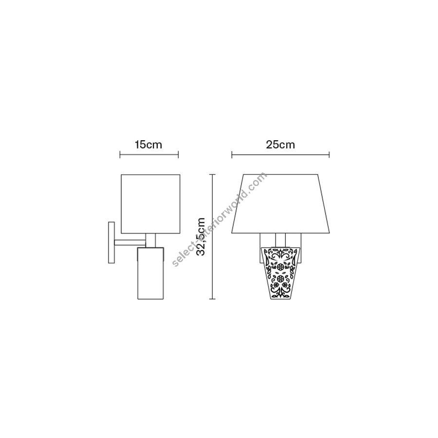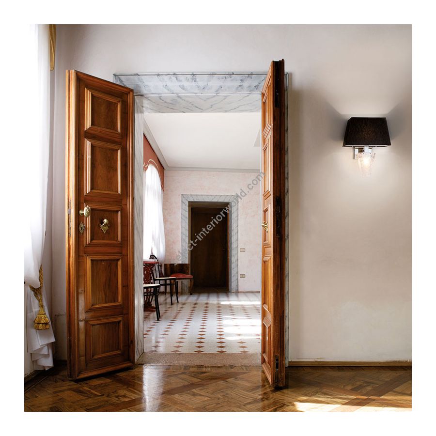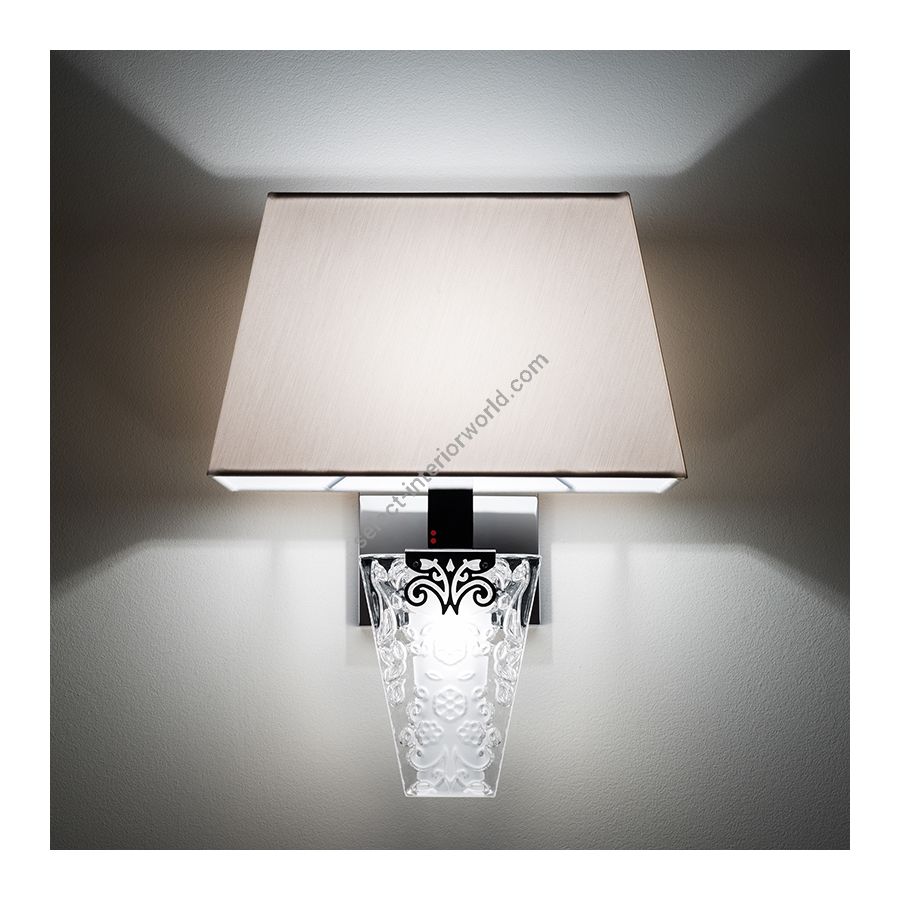 The Vicky wall lamp has a very classic shape that has a modern touch. It has a double light source: a halogen bulb on the decorated glass and another on the diffuser in black and white fabric. The lamp is suitable for luxury and elegant decor, but also to give value to anonymous spaces.
