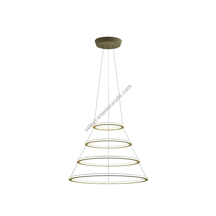 The set of suspension luminaires is a work composed of metal rings, adorned with brass details. Each ring contains an opaline acrylic diffuser both on the outside and inside, allowing for uniform diffusion of a warm, integrated LED light source. This meticulous composition offers exceptional versatility: by combining the five different ring diameters, a wide range of possible volumes and shapes are displayed.