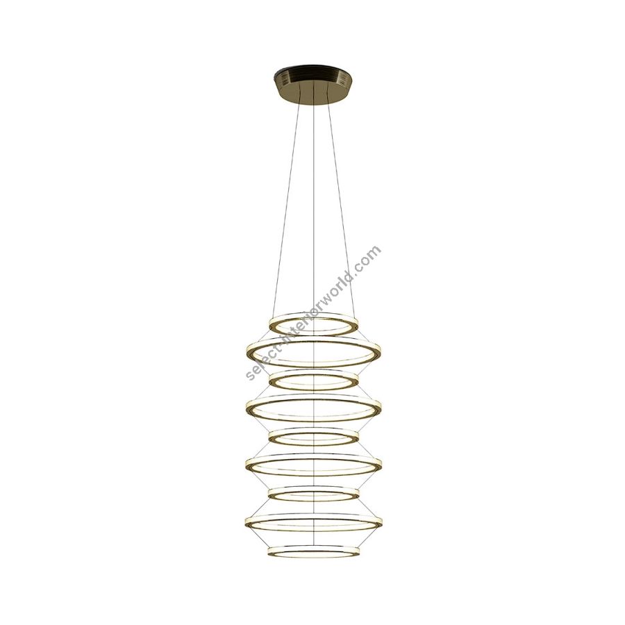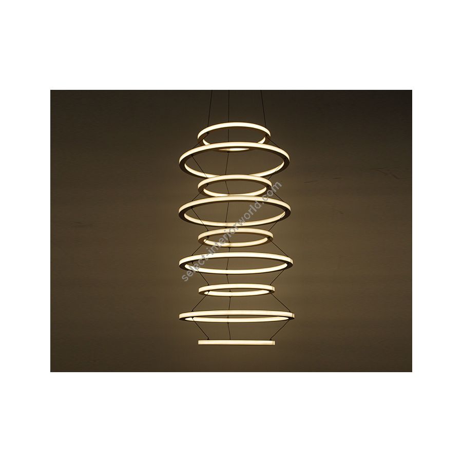 The set of suspension luminaires is a work composed of metal rings, adorned with brass details. Each ring contains an opaline acrylic diffuser both on the outside and inside, allowing for uniform diffusion of a warm, integrated LED light source. This meticulous composition offers exceptional versatility: by combining the five different ring diameters, a wide range of possible volumes and shapes are displayed.