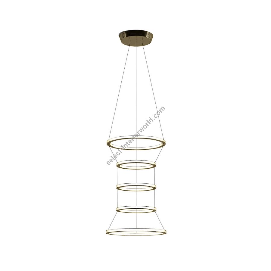 The set of suspension luminaires is a work composed of metal rings, adorned with brass details. Each ring contains an opaline acrylic diffuser both on the outside and inside, allowing for uniform diffusion of a warm, integrated LED light source. This meticulous composition offers exceptional versatility: by combining the five different ring diameters, a wide range of possible volumes and shapes are displayed.