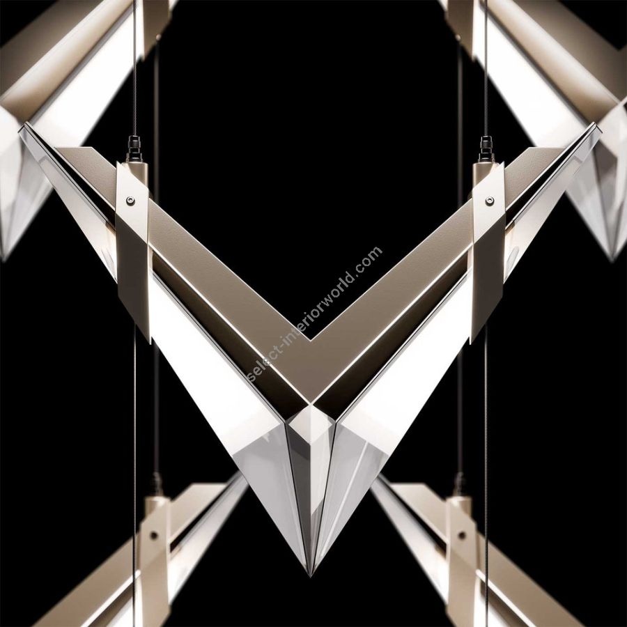 Inspired by the bold geometry of chevron shapes and the sleek lines of modern aircraft, Blade brings a sense of motion and precision to lighting design and merges sleek design with modern functionality. Pendant features cut crystal and integrated LEDs in Standard Black Iron or Champagne finish. Dark Walnut stained wood featured on select items adding warmth to the metal forms.