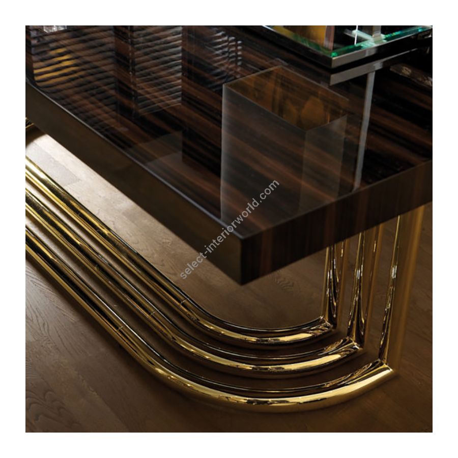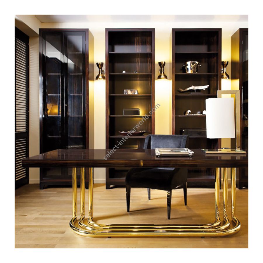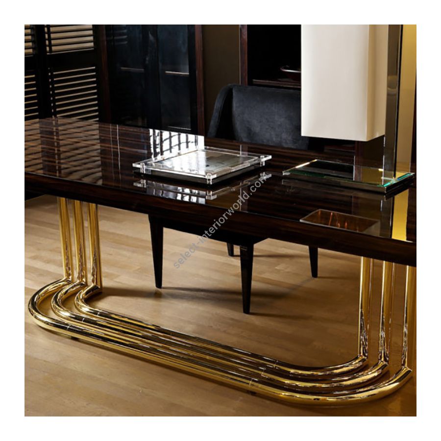 William is an elegant and scenic writing desk. It has been design to be the focal point into representative area and presidential offices. The Makassar Ebony Veneer top is supported by a sculptural metallic basis that is composed by three cylindrical elements that are perfectly aligned between them. The final aesthetic result is a game of balance between the basic and the metallic structure that is able to transmit a feeling of charming majesty. Top 7 cm thick.