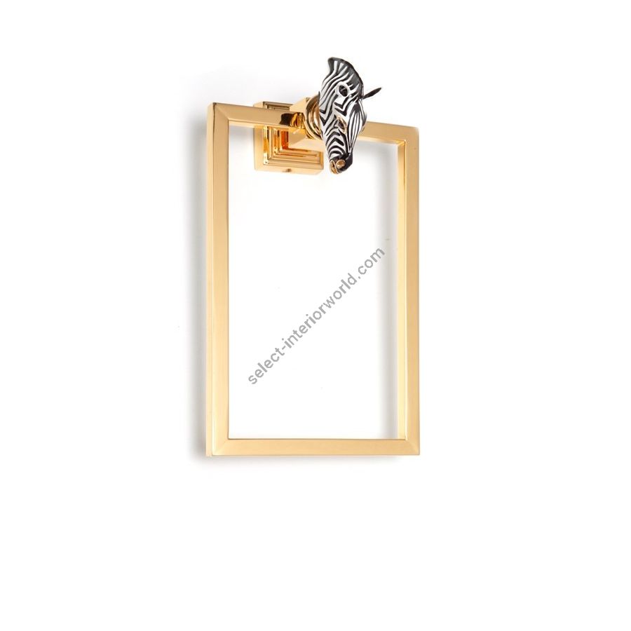 Square towel holder in gold 24k with micro casting of enameled brass zebra. Functional elements that create an extremely elegant, welcoming and high-value bathroom.