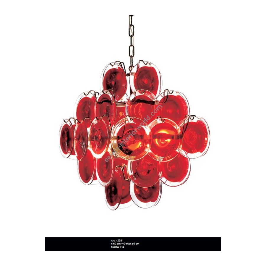 Chandelier with red discs in Murano glass. Lighting fixture that diffuses the light into the surrounding environment with great effect, creating a warm and welcoming atmosphere.