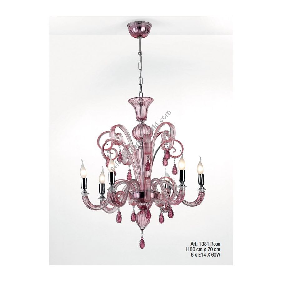 Pink Murano glass chandelier with 6 lights, without lampshades. Lighting fixture that diffuses the light into the surrounding environment with great effect, creating a warm and welcoming atmosphere.