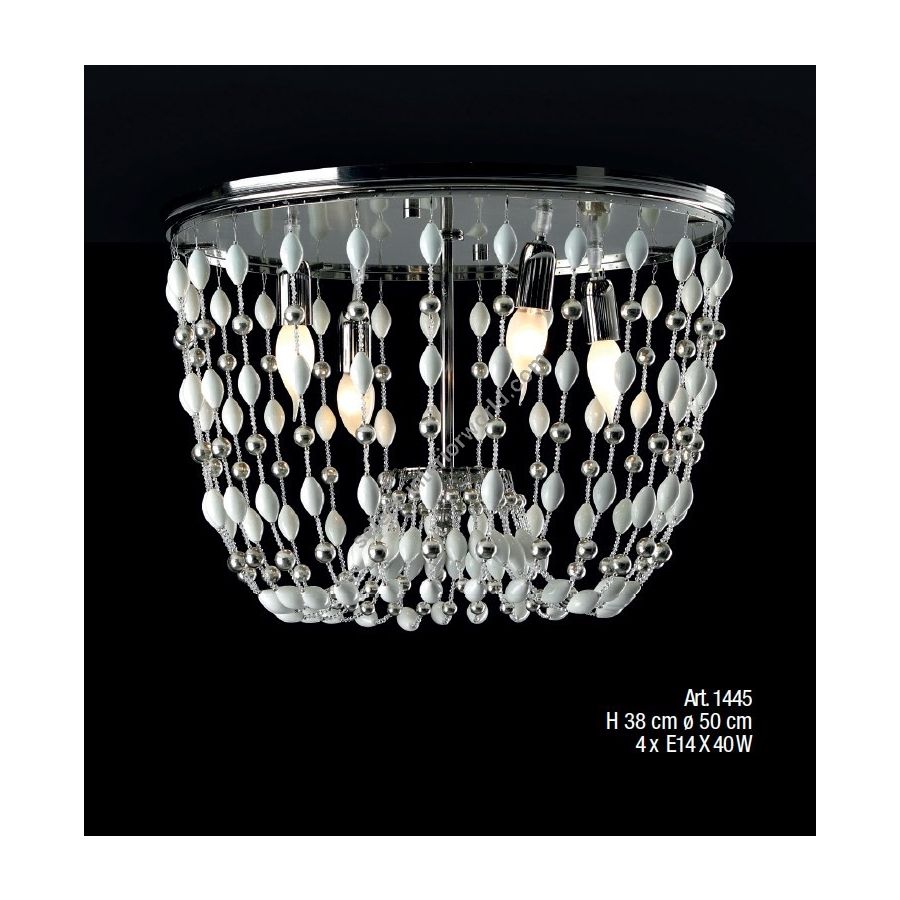 Ceiling lamp with rows of glass paste pearls and hand-threaded crystals. Lighting fixture that diffuses the light into the surrounding environment with great effect, creating a warm and welcoming atmosphere.