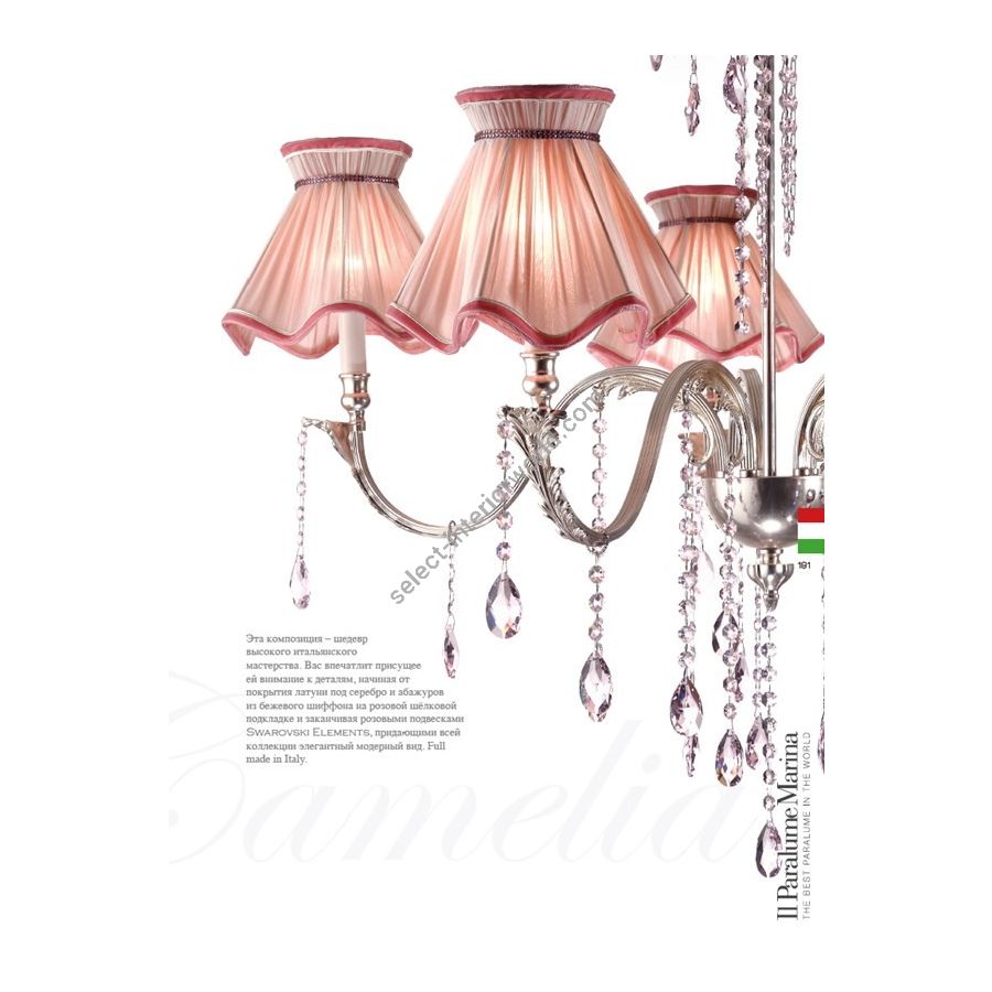 Romantic chandelier with graceful pink lampshade and crystal pendants. Lighting item that diffuses the light with great effect in the surrounding environement creating a warm and welcoming atmosphere.