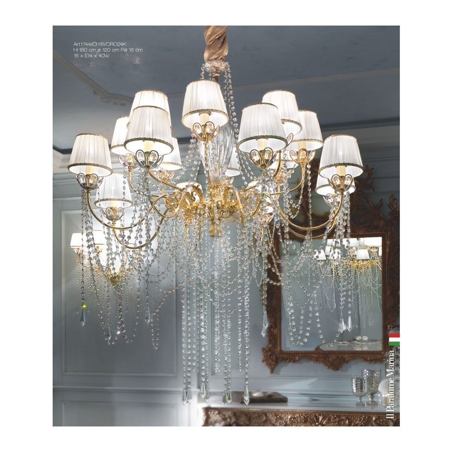 Chandelier 16 lights in cast brass finish ORO 24 Kt with cups crystals and double layer lampshades. Lighting item that diffuses the light with great effect in the surrounding environement creating a warm and welcoming atmosphere.