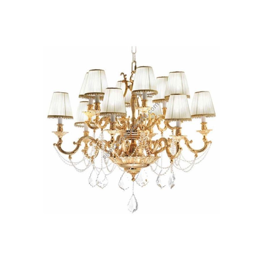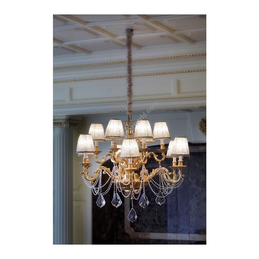 Chandelier 12 lights in cast brass, ivory lampshades and clear Asfour® crystals on transparent Murano glass pearls. Lighting item that diffuses the light with great effect in the surrounding environement creating a warm and welcoming atmosphere.