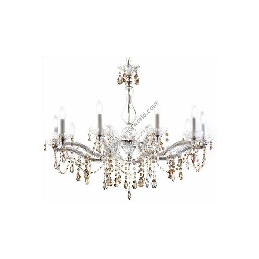 Clear glass chandelier in Mariateresa style with coloured crystal pendants . Lighting item that diffuses the light with great effect in the surrounding environement creating a warm and welcoming atmosphere.