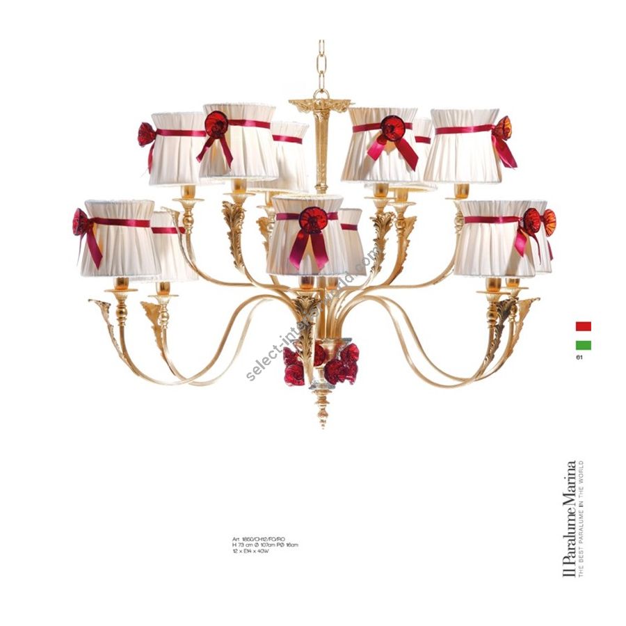 12 lights Chandelier in cast brass with red Murano glass flowers. Included lampshades in double fabric with red ribbons and glass flowers. Lighting item that diffuses the light with great effect in the surrounding environement creating a warm and welcoming atmosphere.