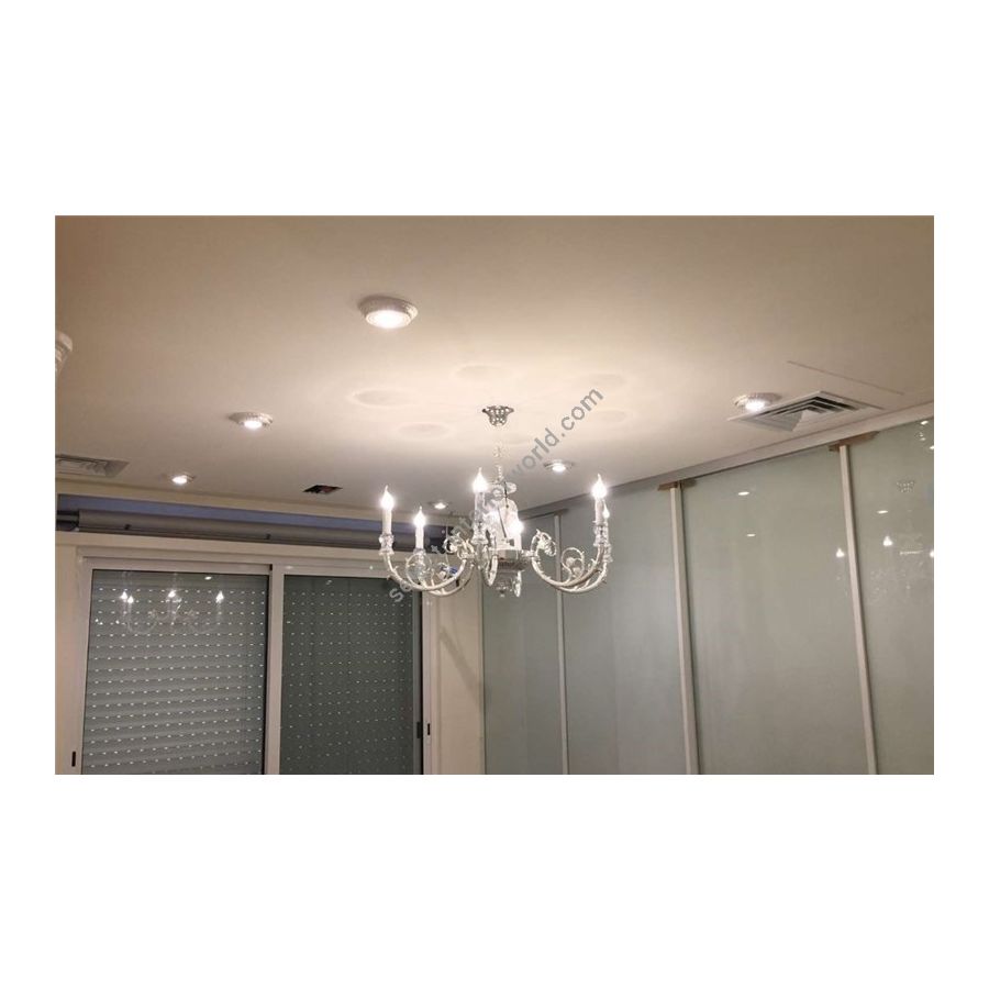 6 lights Chandelier in cast brass and Florentine crystal. Lighting item that diffuses the light with great effect in the surrounding environement creating a warm and welcoming atmosphere.