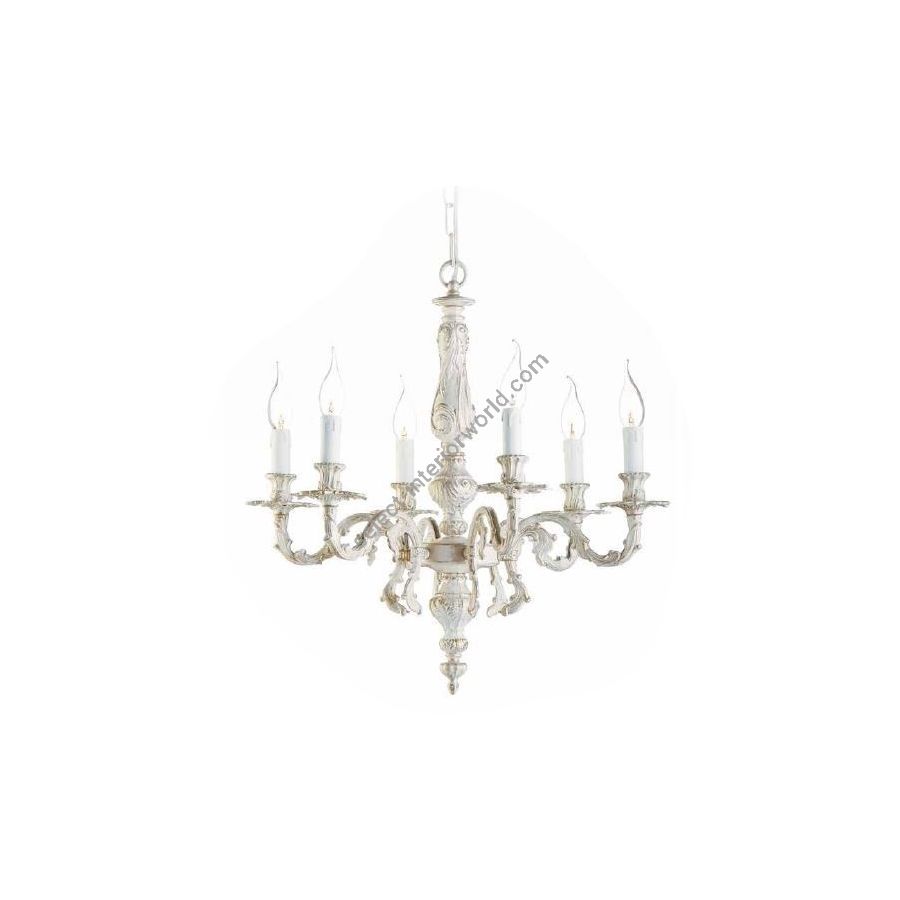 6 lights Chandelier in white with gold colour. Lighting item that diffuses the light with great effect in the surrounding environement creating a warm and welcoming atmosphere.