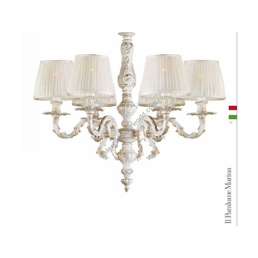 6 lights Chandelier in white with gold colour. Lighting item that diffuses the light with great effect in the surrounding environement creating a warm and welcoming atmosphere.