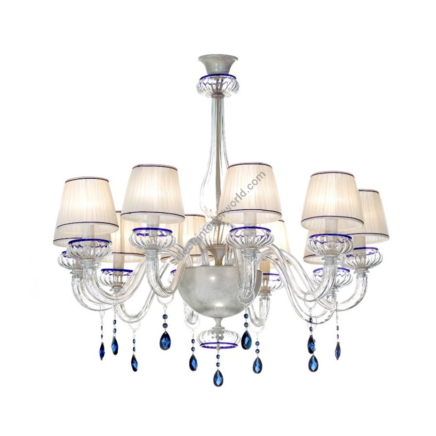Murano Glass chandelier transparent with Blue decoration and Swarovsky® Elements. Lighting item that diffuses the light with great effect in the surrounding environement creating a warm and welcoming atmosphere.