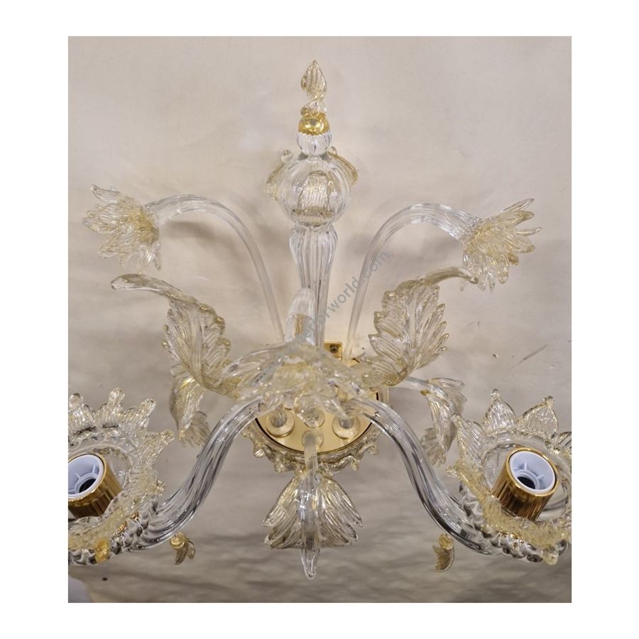 Murano Glass wall sconce with decorations in transparent + gold powder. Lighting item that diffuses the light with great effect in the surrounding environement creating a warm and welcoming atmosphere.