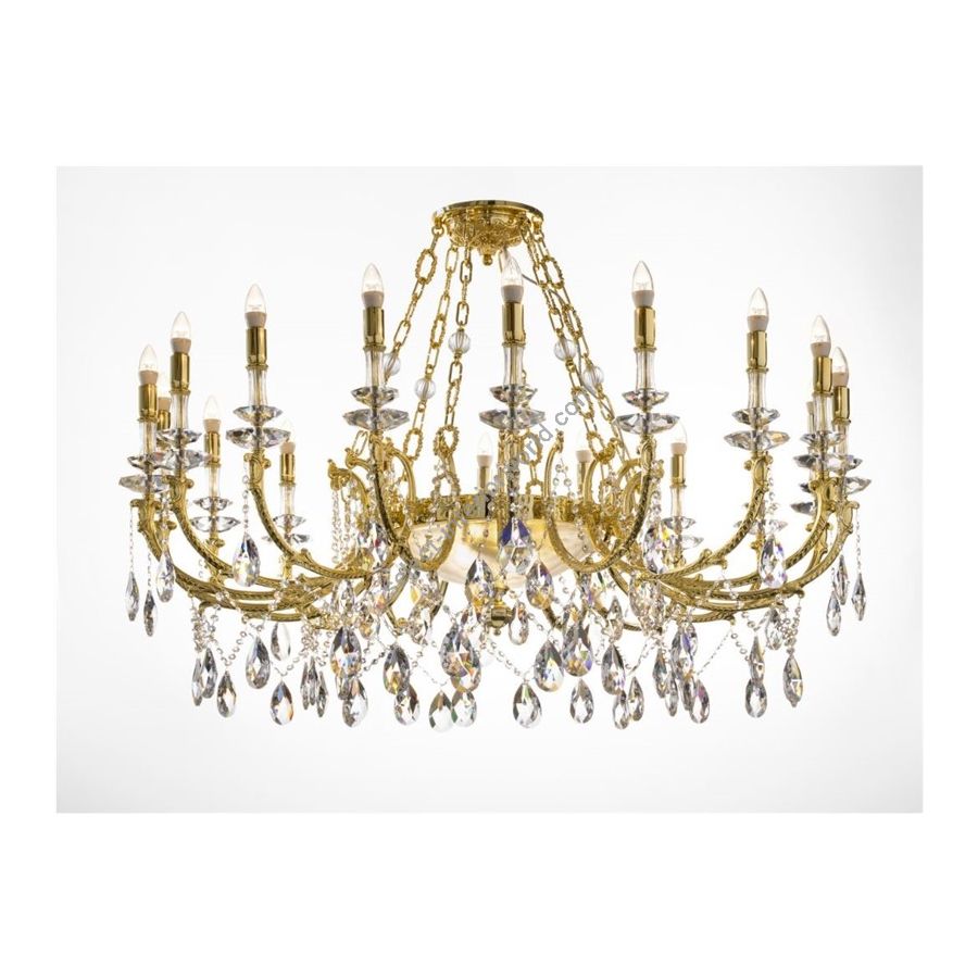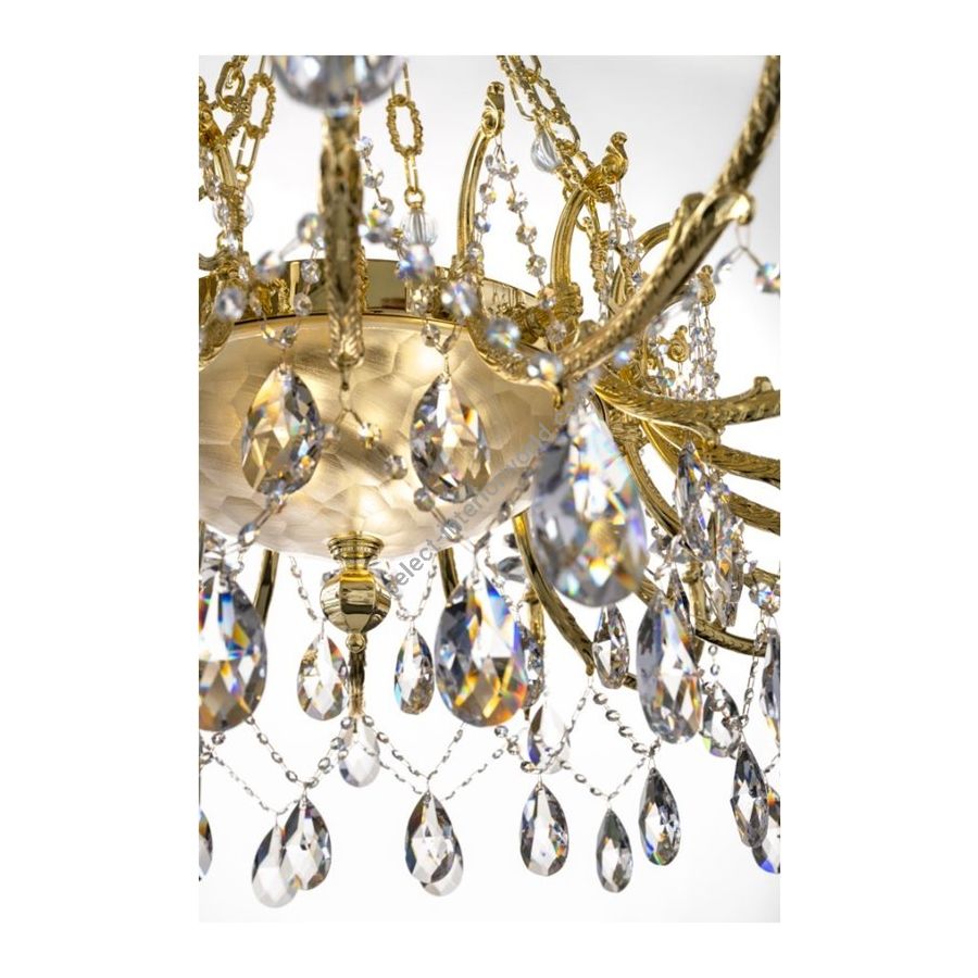 Royal Crystal and Gold Chandelier A magnificent classic chandelier, crafted with the utmost attention to detail and luxury. Made from solid brass in a high-polished brass finish, this exquisite piece embodies timeless elegance and authentic Italian craftsmanship. The chandelier is adorned with Asfour crystal pendants, renowned for their exceptional clarity and brilliance, creating a dazzling interplay of light and reflections. At its center, a Florentine crystal bowl with a frosted (sandblasted) finish adds depth and sophistication to the design. The chandelier features 18 gracefully curved arms, each fitted with an E14 bulb (also available with E12 sockets for the U.S. market), plus 3 additional bulbs inside the central bowl for enhanced illumination. Dimensions: Diameter: 130 cm (˜ 51.2 in) Height: 90 cm (˜ 35.4 in) Weight: 80 kg (˜ 176 lb) Perfect for luxurious interiors, grand dining rooms, and prestigious living spaces, this chandelier stands as a symbol of opulence and refined taste. Also available in other metal finishes, upon request.