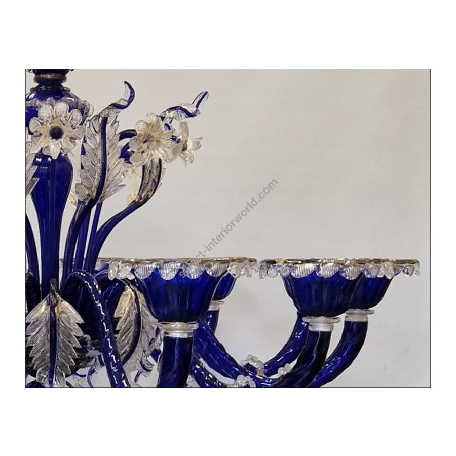 A stunning Murano chandelier in deep blue with transparent gold decorations is an extraordinary work of art. Hand-blown glass takes intricate and detailed forms, while the deep blue captures the gaze, creating an atmosphere of mystery and luxury. The golden decorations, crafted with gold leaf or golden pigments, add a touch of elegance. This chandelier diffuses a magical light, transforming any space into a place of wonder and admiration.