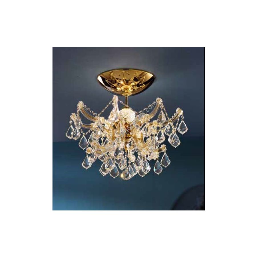 Mariateresa chandelier with Gold plated metal frame covered by transparent glass arms and transparent Crystal pendants. Lighting item that diffuses the light with great effect in the surrounding environement creating a warm and welcoming atmosphere.