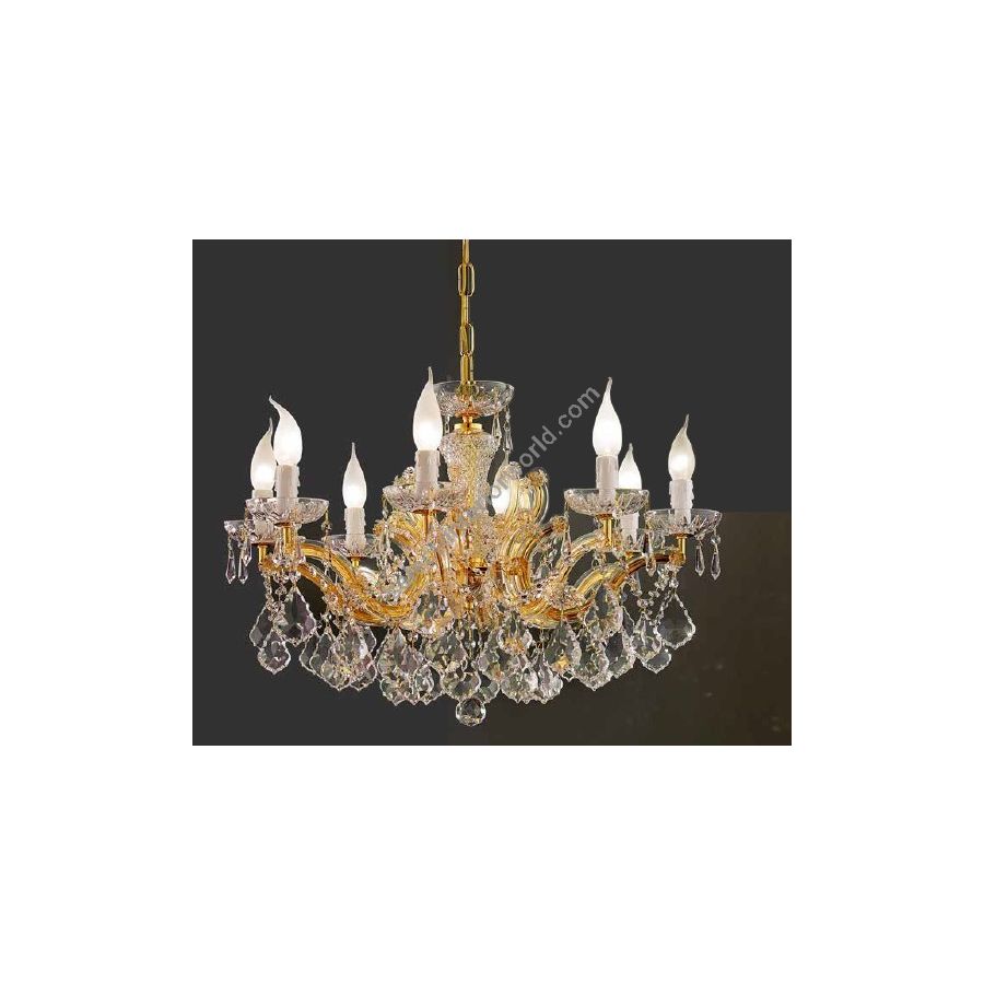 Gold plated metal frame covered by transparent glass arms and transparent Crystal pendants. Lighting item that diffuses the light with great effect in the surrounding environement creating a warm and welcoming atmosphere.