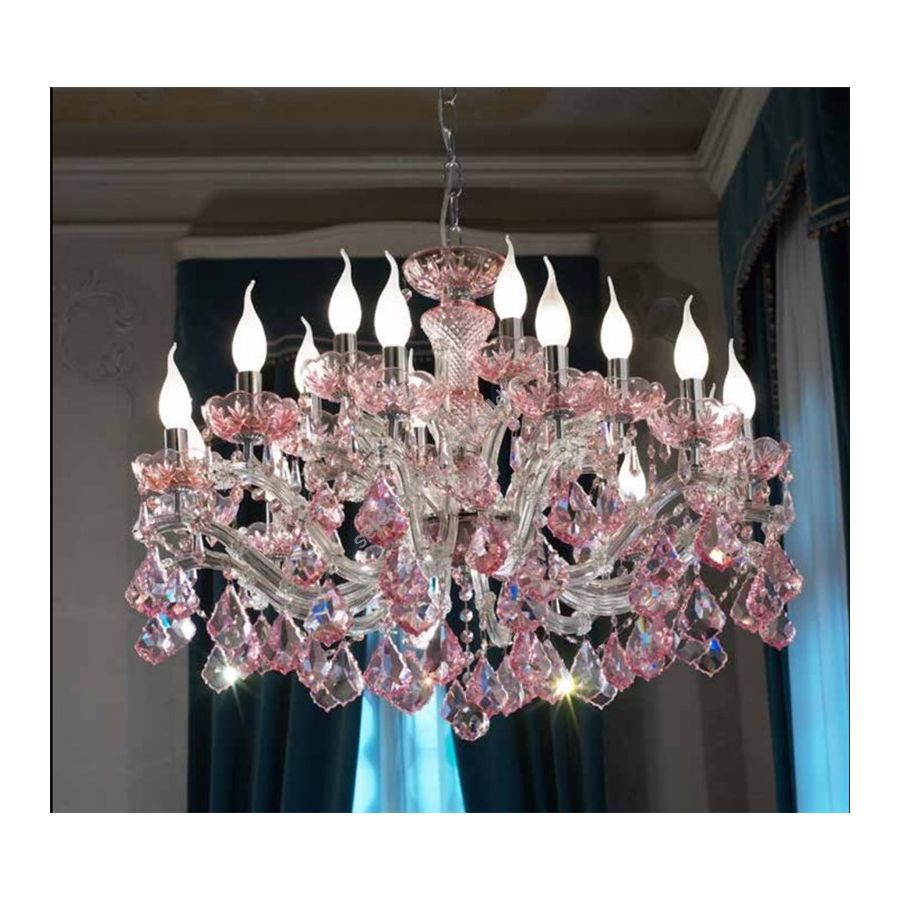 Mariateresa chandelier with metal frame polished nikel covered by transparent glass arms and pink Crystal pendants. Lighting item that diffuses the light with great effect in the surrounding environement creating a warm and welcoming atmosphere.