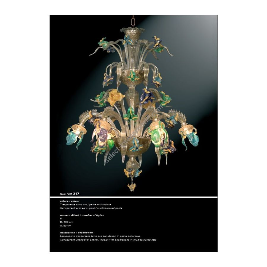 Transparent all-gold 6-light chandelier with polychrome paste decorations. Lighting fixture that diffuses the light into the surrounding environment with great effect, creating a warm and welcoming atmosphere.