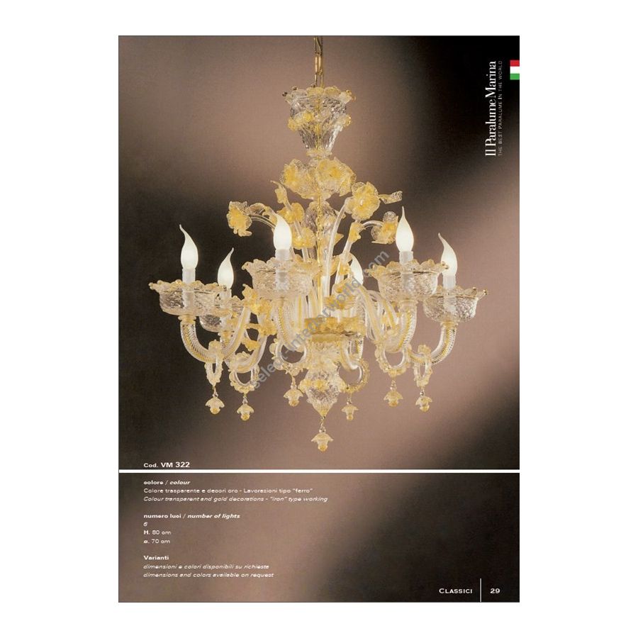 6 lights chandelier in transparent color with gold decorations. Processing type ""iron"". Lighting fixture that diffuses the light into the surrounding environment with great effect, creating a warm and welcoming atmosphere.