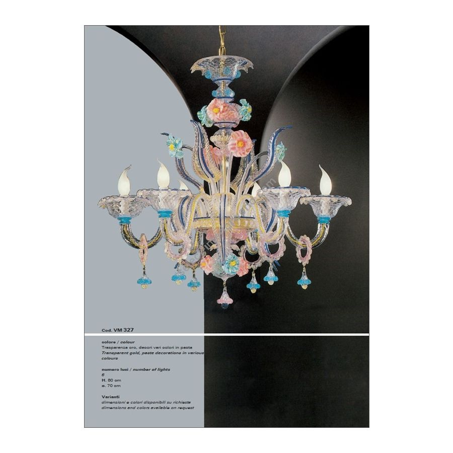 6 lights transparent gold chandelier with various decorations and paste colors. Lighting fixture that diffuses the light into the surrounding environment with great effect, creating a warm and welcoming atmosphere.