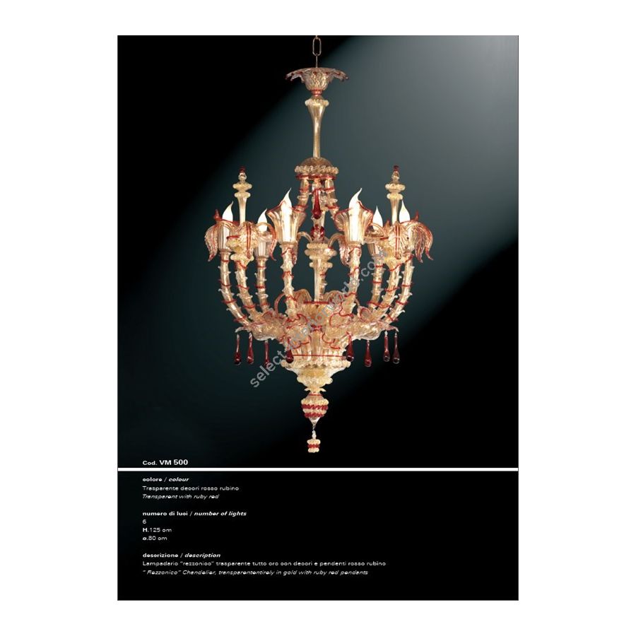 Transparent all-gold “Rezzonico” chandelier with ruby red decorations and pendants, 6 lights. Lighting fixture that diffuses the light into the surrounding environment with great effect, creating a warm and welcoming atmosphere.