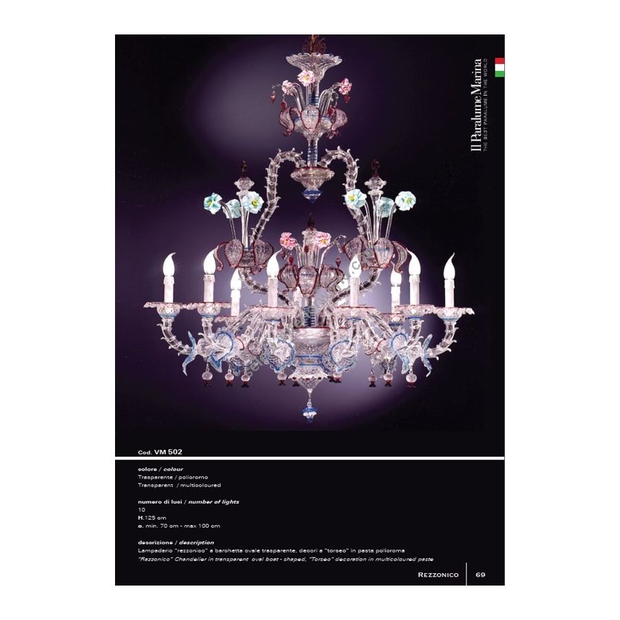 “Rezzonico” transparent oval boat chandelier, “torseo” decorations in polychrome paste, 10 lights. Lighting fixture that diffuses the light into the surrounding environment with great effect, creating a warm and welcoming atmosphere.