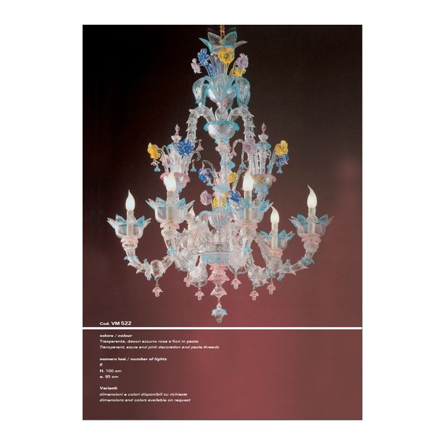 6 lights transparent chandelier, pink blue decorations and paste flowers. Lighting fixture that diffuses the light into the surrounding environment with great effect, creating a warm and welcoming atmosphere.