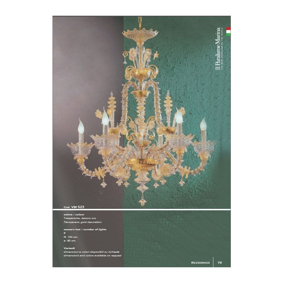 6 lights transparent chandelier, gold decoration. Lighting fixture that diffuses the light into the surrounding environment with great effect, creating a warm and welcoming atmosphere.