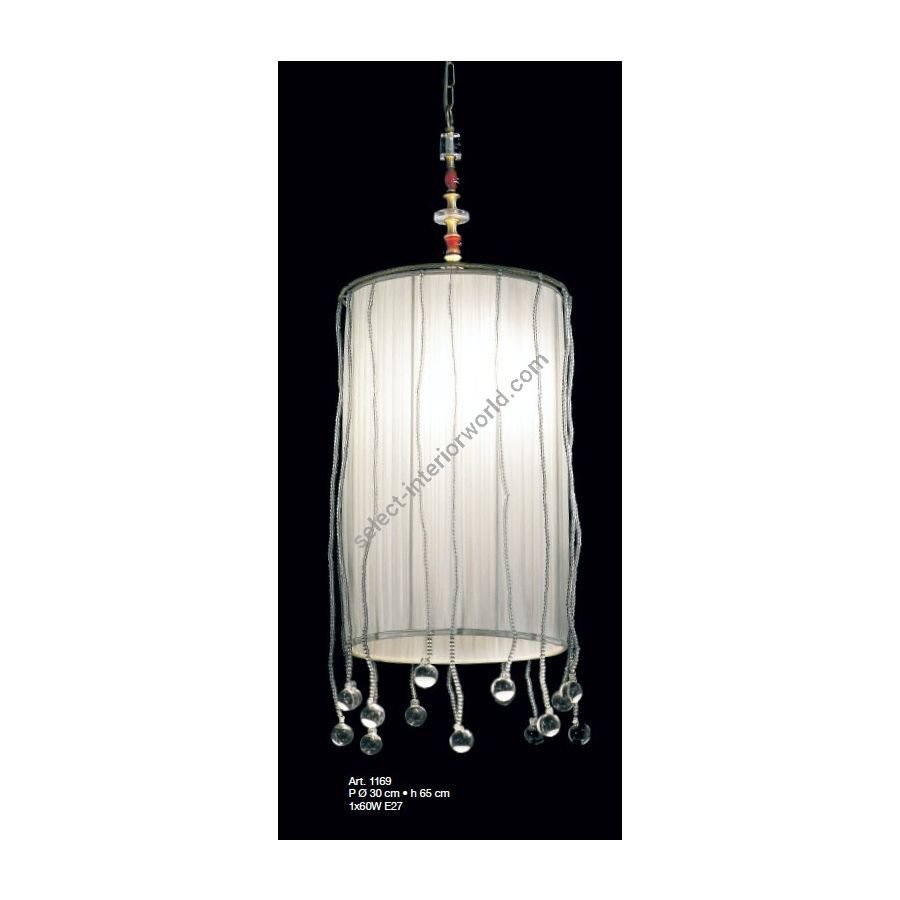 Cilindrical chiffon lampshade suspension with spheres of Murano glass. Lighting item that diffuses the light with great effect in the surrounding environement creating a warm and welcoming atmosphere.