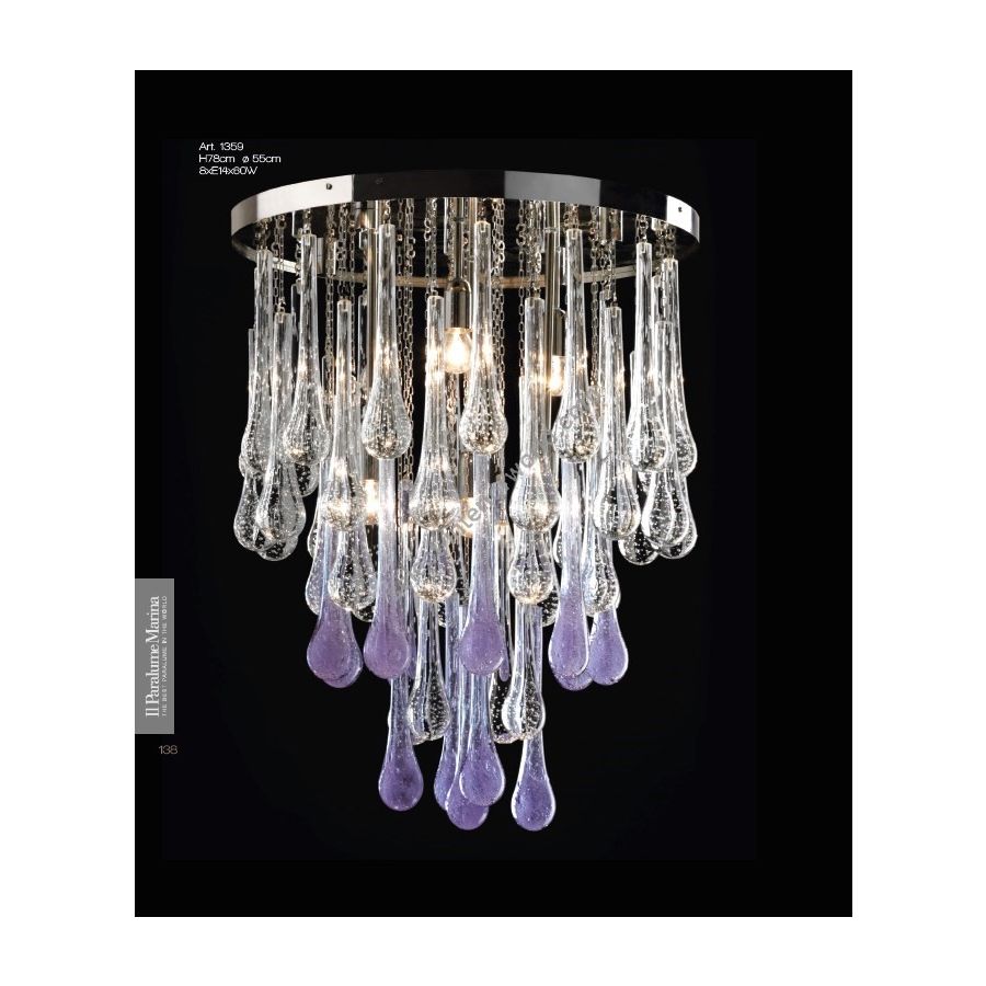 Chandelier with "Drop" Murano glass elements transparent and violet. Lighting item that diffuses the light with great effect in the surrounding environement creating a warm and welcoming atmosphere.