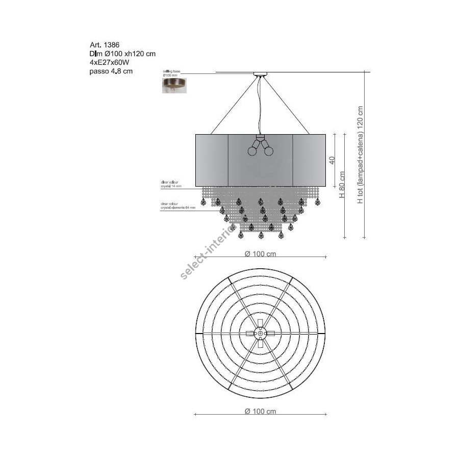 Chandelier with lampshade and Asfour crystals. Lighting item that diffuses the light with great effect in the surrounding environement creating a warm and welcoming atmosphere.