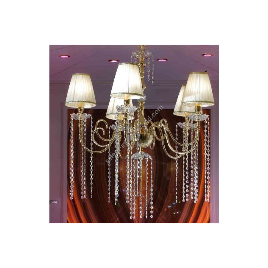 Chandelier 5 lights with pendants in Asfour crystal and double fabric lampshades. Lighting item that diffuses the light with great effect in the surrounding environement creating a warm and welcoming atmosphere. The crystal cups that are out of production will be replaced with similar one