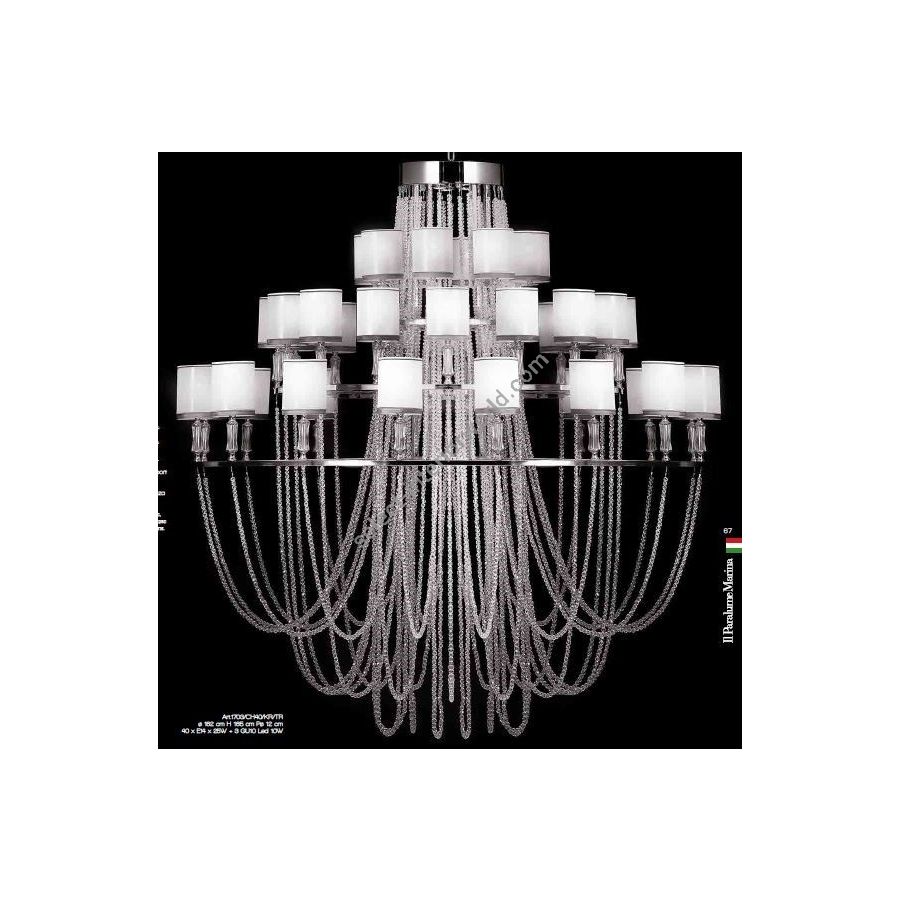 Chandelier 40 lights, brass circles with rows of crystal pearls. Lampshades in white shiny organza on pvc with silver thread trimming. Lighting item that diffuses the light with great effect in the surrounding environement creating a warm and welcoming atmosphere.