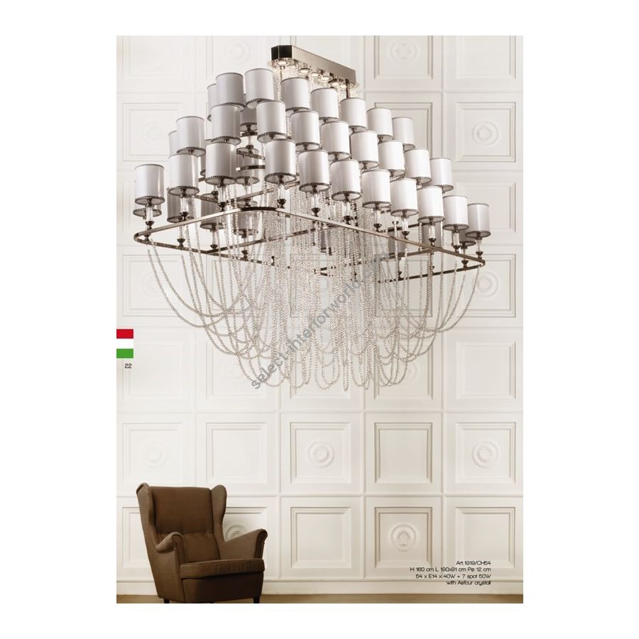 54 lights Chandelier in brass rectangular with rounded corners and Asfour® cristals. Lighting item that diffuses the light with great effect in the surrounding environement creating a warm and welcoming atmosphere.