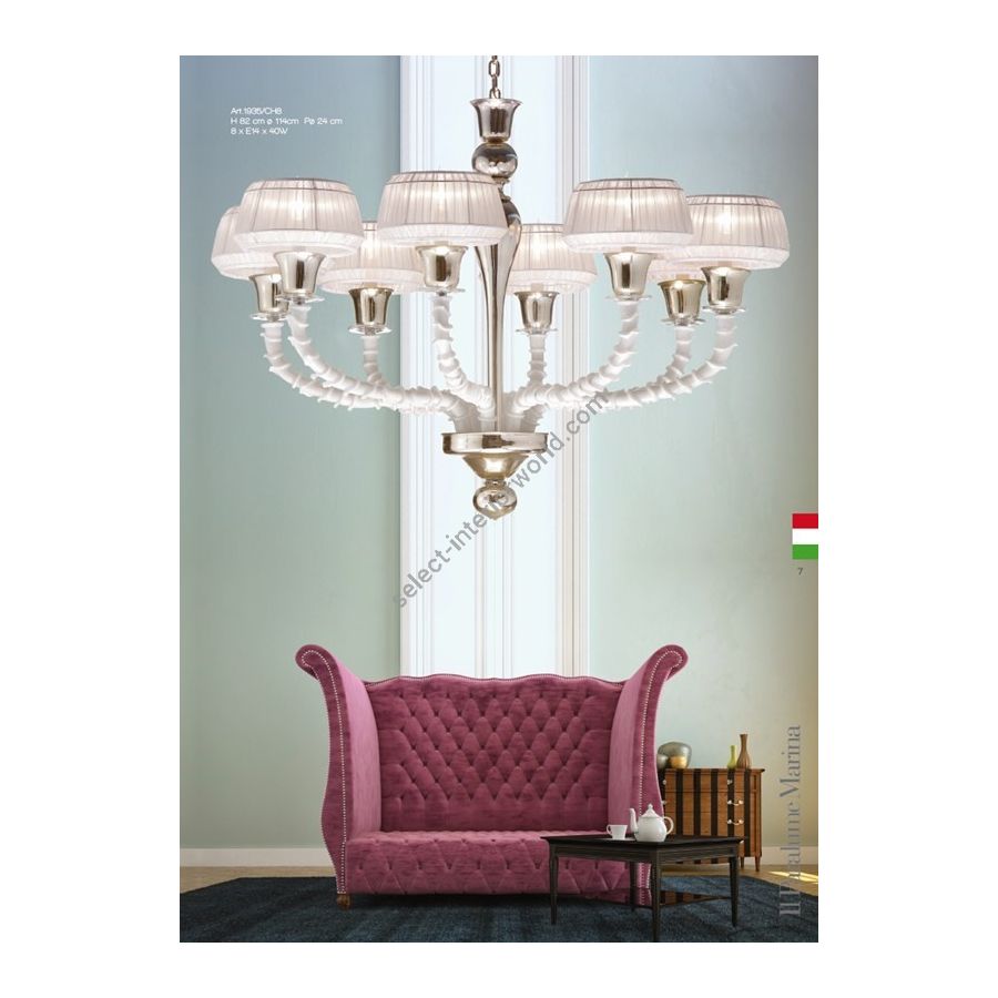 8 lights Chandelier in Murano glass with mirror effect. Lighting item that diffuses the light with great effect in the surrounding environement creating a warm and welcoming atmosphere.