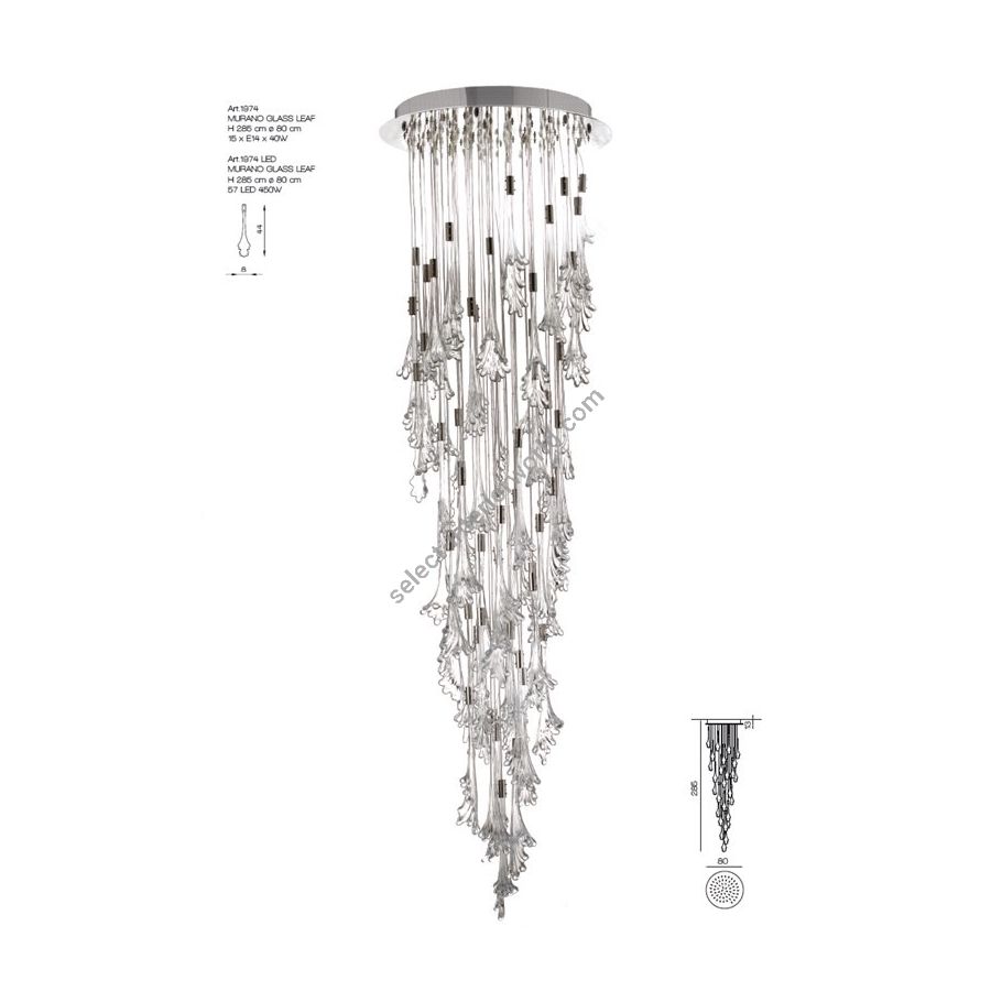 Cascade Chandelier with "Leaf" Murano glass elements. Lighting item that diffuses the light with great effect in the surrounding environement creating a warm and welcoming atmosphere.