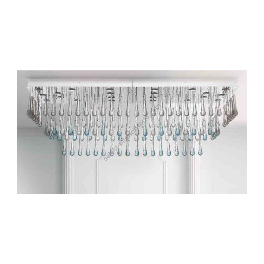 Steel Ceiling lamp with transparent and light blue Murano Glass drops (Available IP65). Lighting item that diffuses the light with great effect in the surrounding environement creating a warm and welcoming atmosphere.