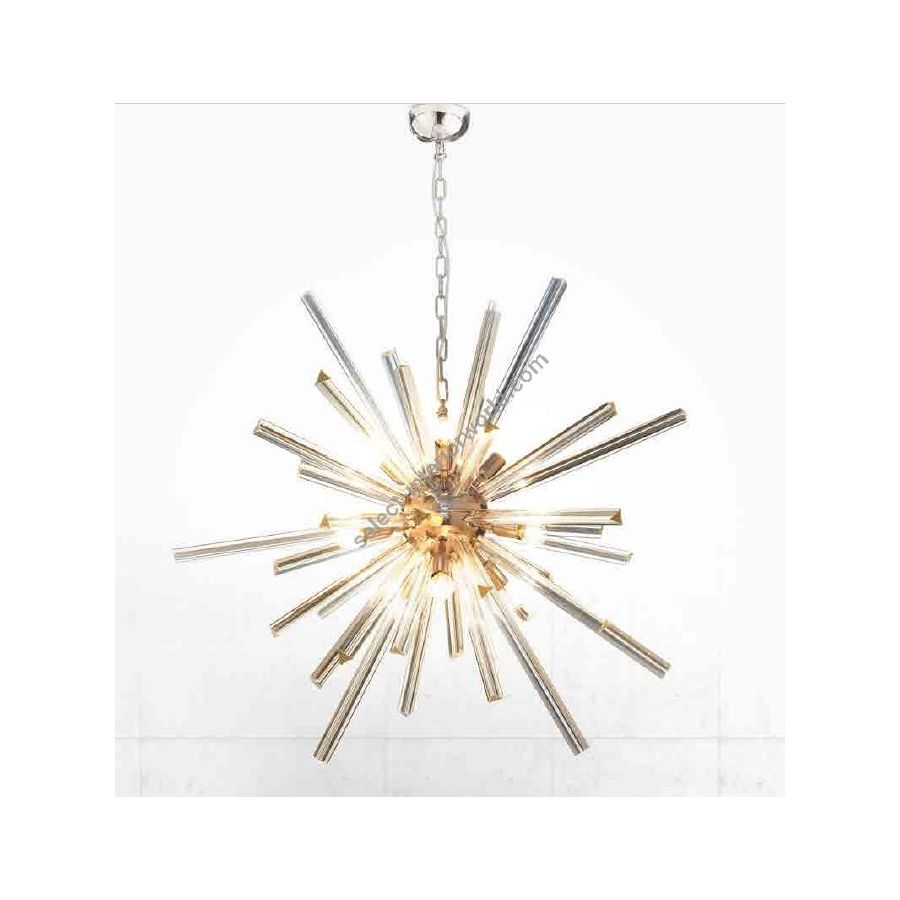 Chandelier with trasparent Trihedrons glasses. Lighting item that diffuses the light with great effect in the surrounding environement creating a warm and welcoming atmosphere.