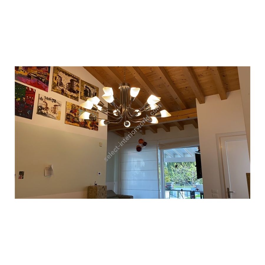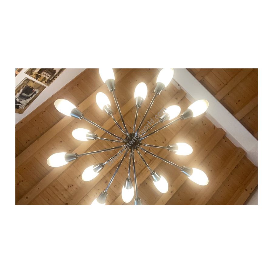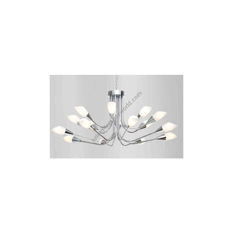 Chandelier with white crystal part. Lighting item that diffuses the light with great effect in the surrounding environement creating a warm and welcoming atmosphere.