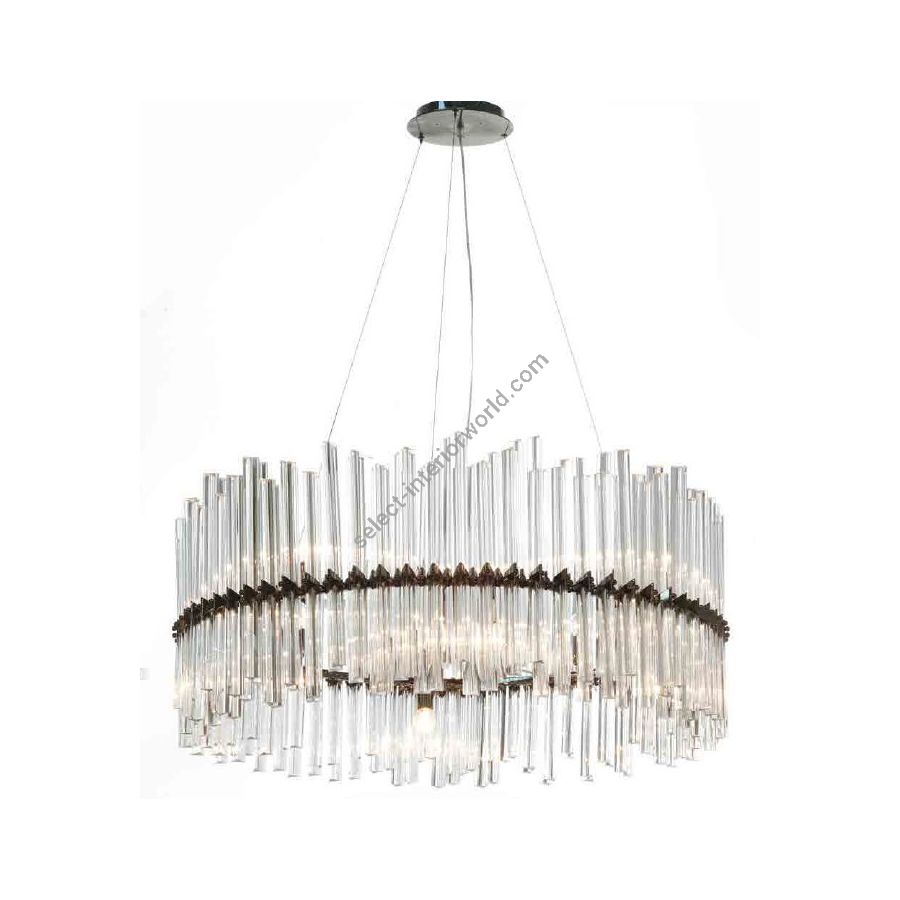 Chandelier with transparent trihedron glasses. Lighting item that diffuses the light with great effect in the surrounding environement creating a warm and welcoming atmosphere.