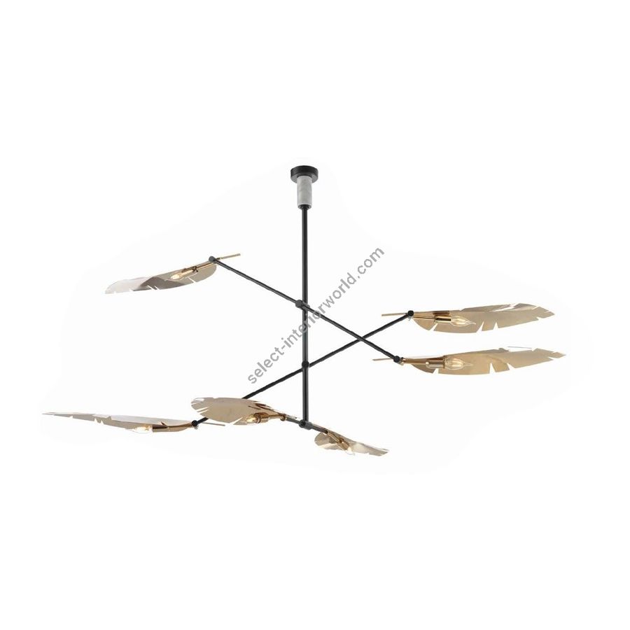 Chandelier decorated with stlilized leaves in brushed soft gold outside and polished finish inside,on matt black metal structure and element in Carrara marble. Lighting item that diffuses the light with great effect in the surrounding environement creating a warm and welcoming atmosphere.
